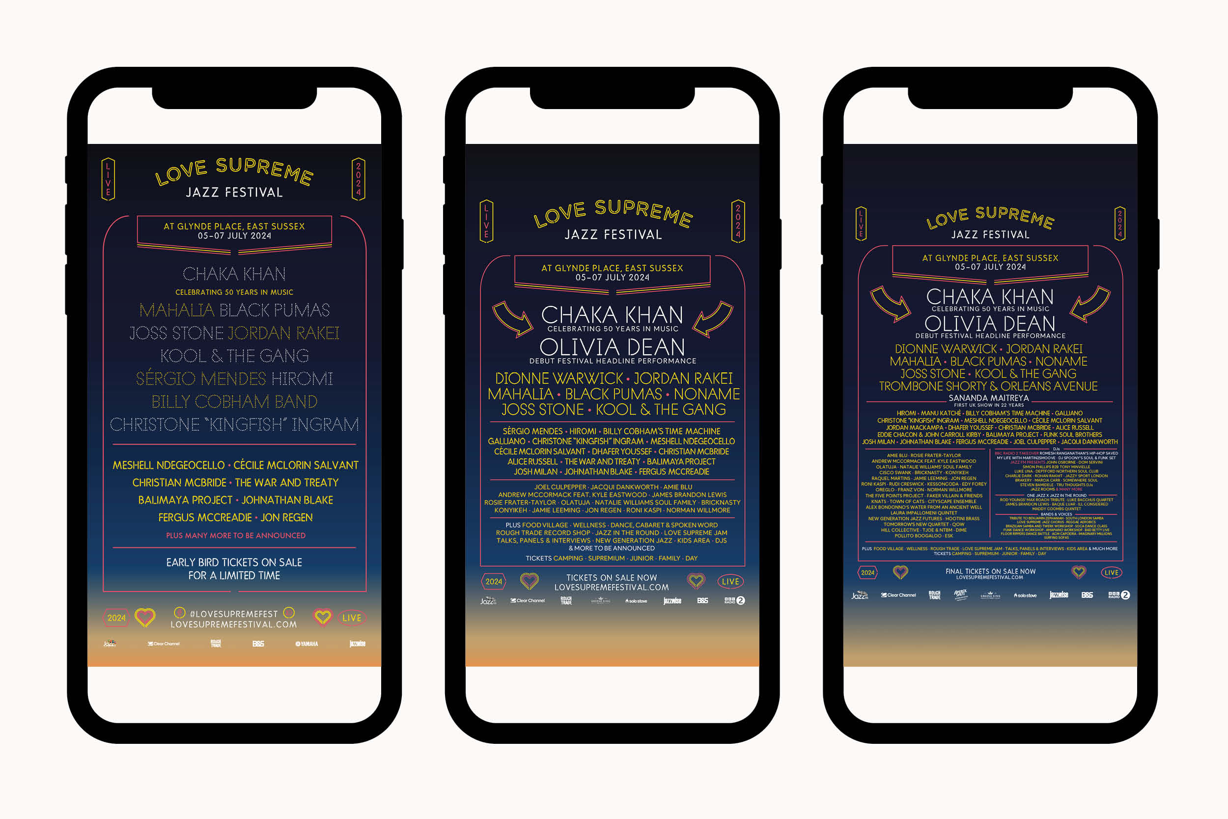 Love Supreme Jazz Festival, then in it’s 12 year, had established itself as Europe’s largest festival of it’s genre. Studio Makgill had created the festival identity and had made the introduction to ABD. Love Supreme were looking to partner with a design studio who could deliver a 360 campaign that would promote the festival through a variety of platforms.